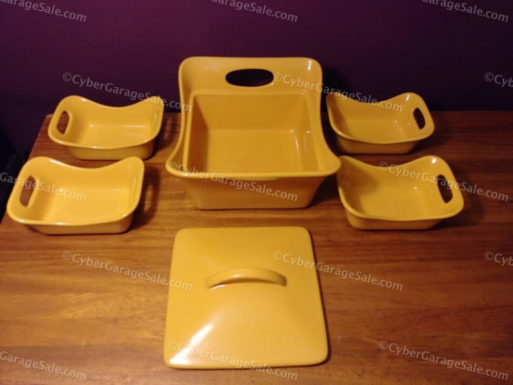 Rachel Ray Stoneware Rectangular Baking Set includes 1 large Casserole Dish with Lid and 4 12oz serving dishes. There are 6 pieces all together. It is a very heavy set.
